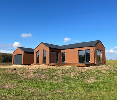 Galimi įvairūs modulinio namelio išplanavimai ir individualūs sprendiniai.